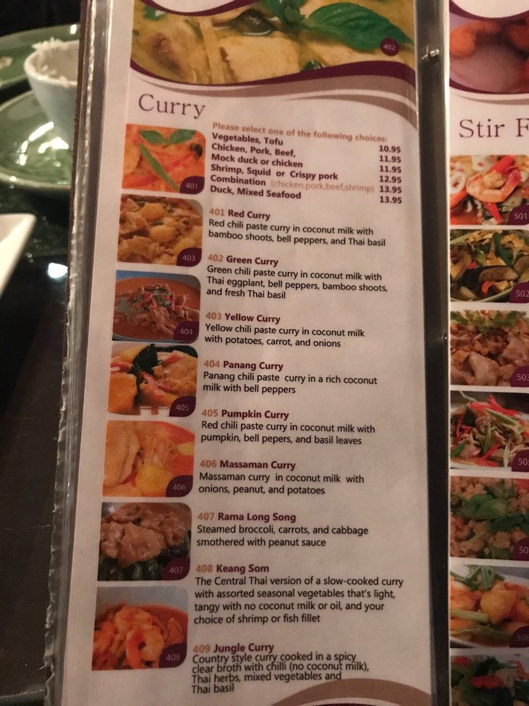 Green chili paste curry in coconut milk with bamboo shoots, eggplant, bell peppers, and Thai basil.