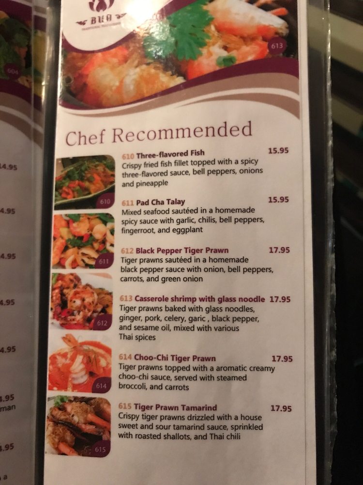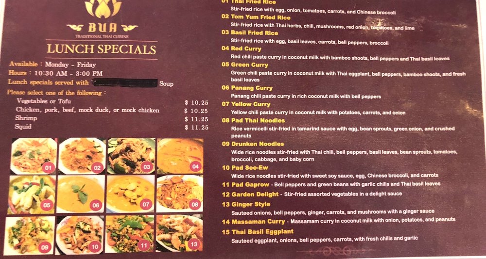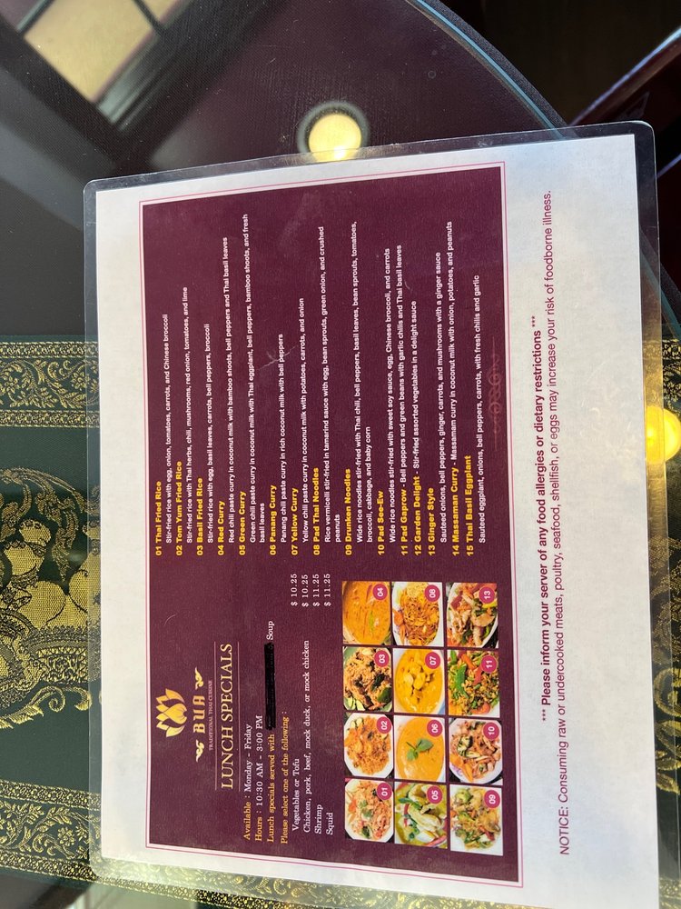 Bua Thai Restaurant, located in Aurora, CO, offers a diverse menu showcasing traditional Thai flavors. From appetizers like Chicken Satay and Vegetable Egg Rolls to rich and flavorful curries like Red Curry and Panang, there is something for every palate. The Tom Yum Soup and Tom Kah Soup are must-tries for soup lovers. Customers rave about the Crystal Noodle Pad Thai and Thai Fried Rice, praising the freshness and bold flavors of the dishes. The restaurant also offers vegan and vegetarian options, making it a great choice for all dietary preferences. With ample seating, friendly service, and a welcoming ambiance, Bua Thai Restaurant is a top choice for delicious Thai cuisine in the area.